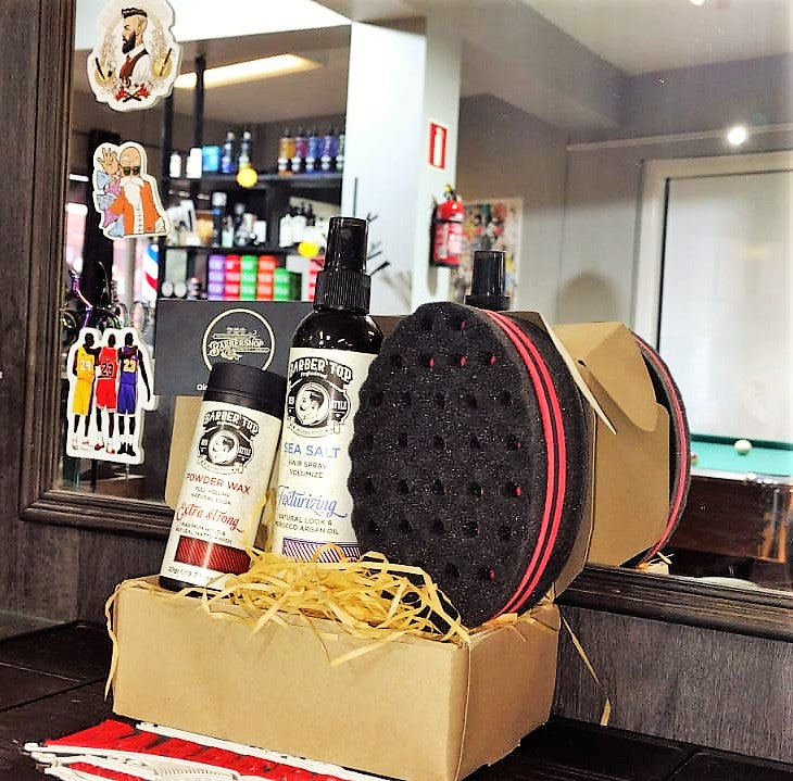 Gift box containing volumizing powder, sea salt texturizing spray, and a sponge for curly/messy styling.