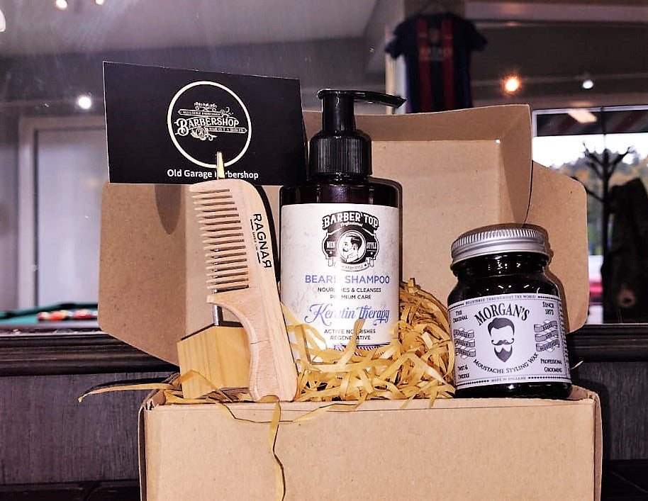 Lahjarasia, jossa puinen viiksikampa, erityinen keratiini saippua viiksille ja erittäin vahva viiksien muotoiluvaha.